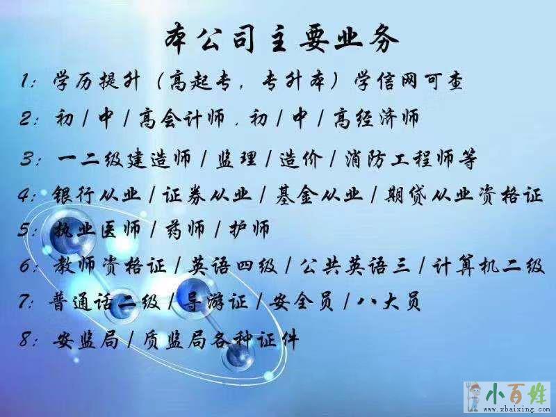 1学历提升,高起专,专升本1教师资格证(幼小初),普通话二甲二乙2一级建造师,二级建造师(出陕西)3初级、中级会计师,初级、中级,高级经济师4一级消防工程师,一级造价工程师5导游从业资格证6健康管理师...